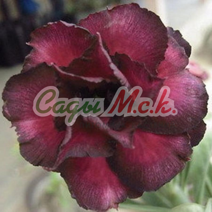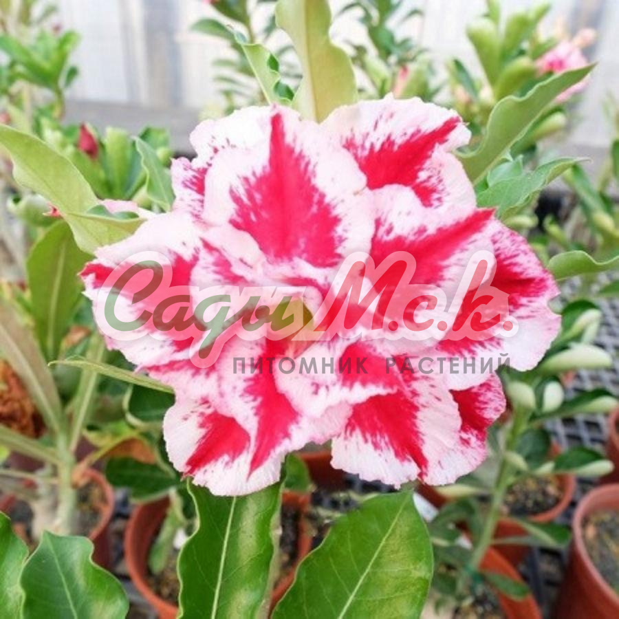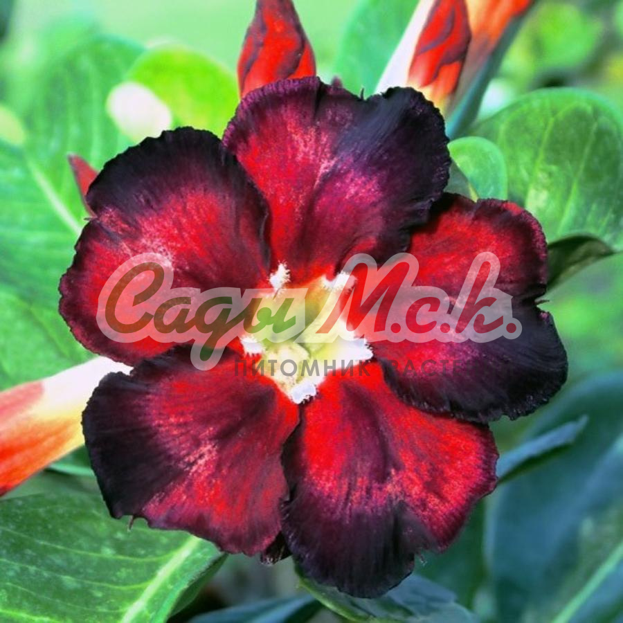 Adenium Double Color - красивый кустарник с мясистым стволом. Листья огромные, глянцевые, темно-зеленые с салатовой полосой. Цветки немахровые, крупные с желтым основанием. Лепестки красные с темно-бордовыми краями.