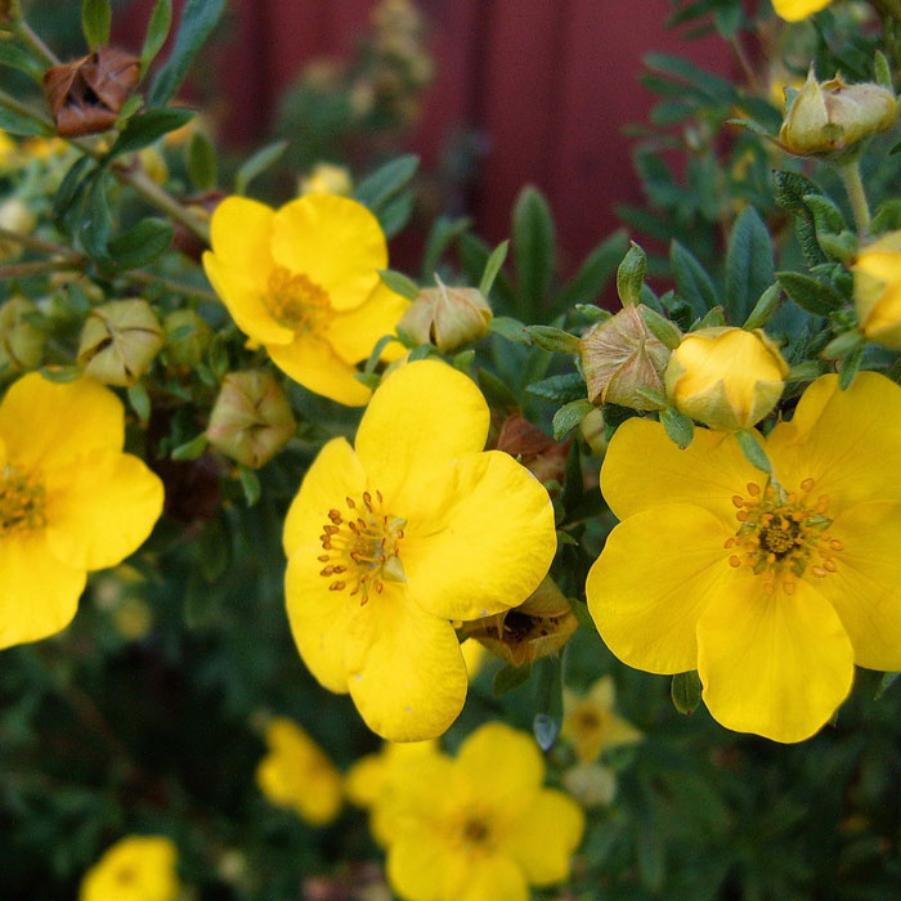 Корни Gold Finger вырастают в компактный кустарник с густой, плотной, подушкообразной кроной, высота до 1-1,3 м. Сложные листья кустарника состоят из нескольких листочков, их пастельный зелёный цвет летом приобретает характерный серебристый оттенок, благодаря ворсистому опушению. Период цветения крупномера Gold Finger начинается в июне, и продолжается вплоть до сентября. Ярко – жёлтые, крупные цветы, по одному либо небольшими группами, усеивают поверхность кроны. Неприхотлив саженец к почве и другим условиям произрастания. Жары и засухи не переносит. Подстригать до 10 см раз в несколько лет