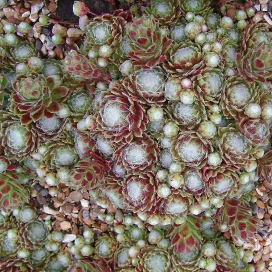 Молодило Super Dome - многолетнее почвопокровное растение. Отличается розетками необычной формы. Листья видны только по краям розетки. Они двуцветные: зеленая кайма и пурпурная серединка. Центральная часть розетки белая.