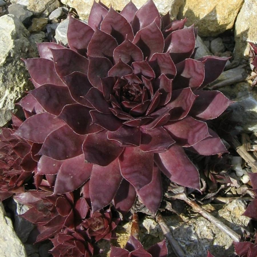 Молодило Twilight Blues - многолетник потрясающей красоты. Розетки напоминают раскрытый махровый цветок. Листья удлиненные, пурпурные со светлыми оттенками и почти белой каймой.