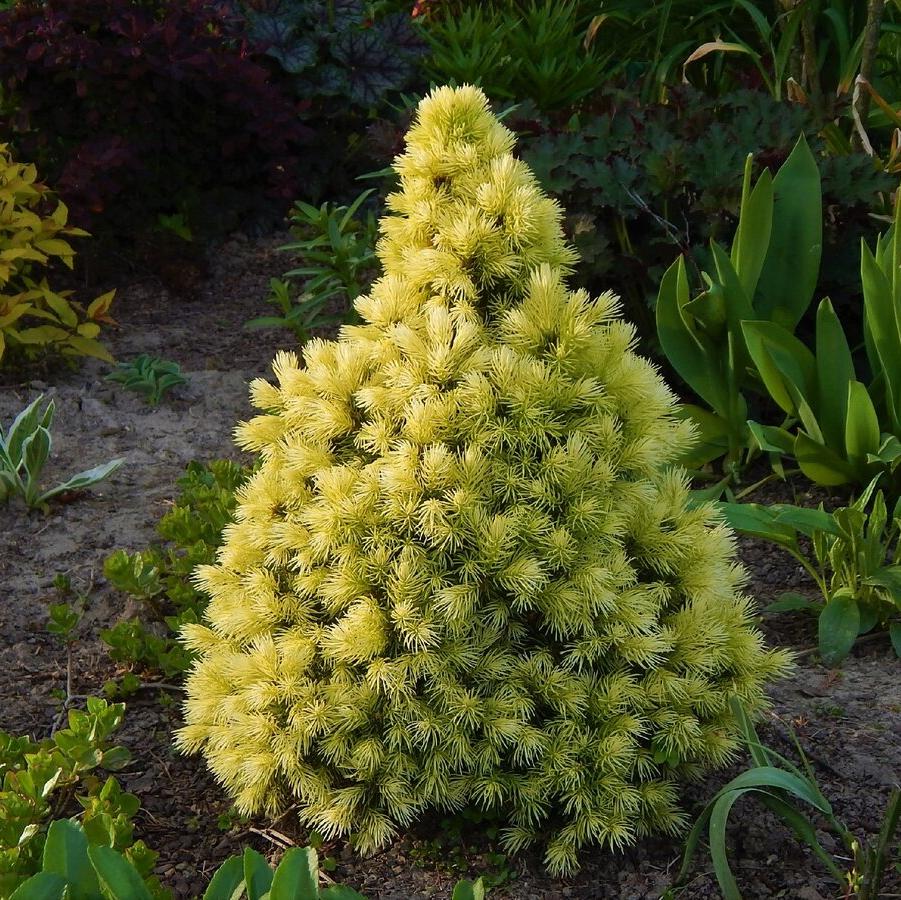 Взрослое растение (около 10 лет) обычно не превышает 0,8 м в высоту, поэтому его используют в альпинариях, небольших садах. Крона плотная, конусообразная. Крупномер сизая Daisy’s White декоративен весной, когда ветви покрываются бело-желтыми приростами, напоминающими новогодние игрушки. Побеги удлиняются и летом, но украшены они темно-зеленой мягкой хвоей. Сорт морозостойкий, любит полутень, потому что на солнце может получить ожоги. семена приживаются на дренированных почвах.