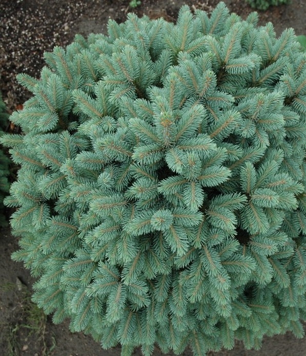 Небольшие растения с шаровидной или широкопирамидальной формой кроны, достигающие к 10-15 годам высоты 60-70 см. Побеги многочисленные, очень короткие и плотно расположенные, внешне растения напоминают сорта канадских елок. Зрелые колючки короткие, жесткие, серо-голубые, молодые приросты очень яркие и броские, при распускание полностью покрывают корпус растения.