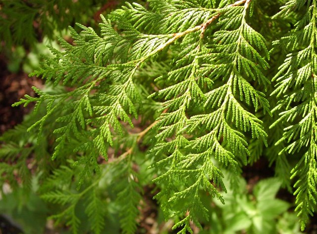 Туя складчатая Аtrovirens - дерево 12-15 м высоты, диаметром 3-5 м. Крона коническая, плотная, компактная. Хвоя насыщено темно-зеленая, блестящая. Растет быстро, часто используется для живых изгородей.