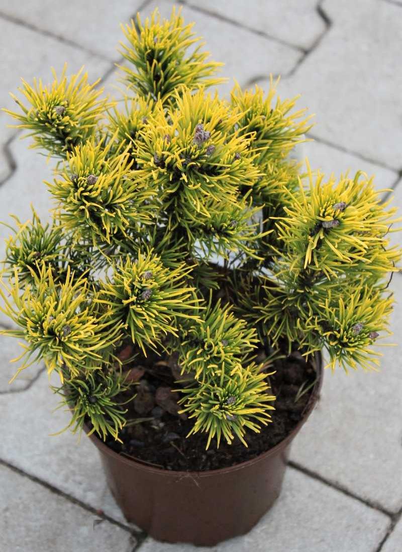 Сосна горная Carstens Wintergold - карликовый хвойный кустарник с плотной, шаровидной, компактной кроной и декоративной хвоей. Растет очень медленно (6-7 см в год), достигает 0,7 метра в высоту и 1,2 м в диаметре. Хвоя короткая, жесткая, блестящая. Летом хвоя темно-зеленая, осенью желтеет и становится золотисто-желтой с медным оттенком.